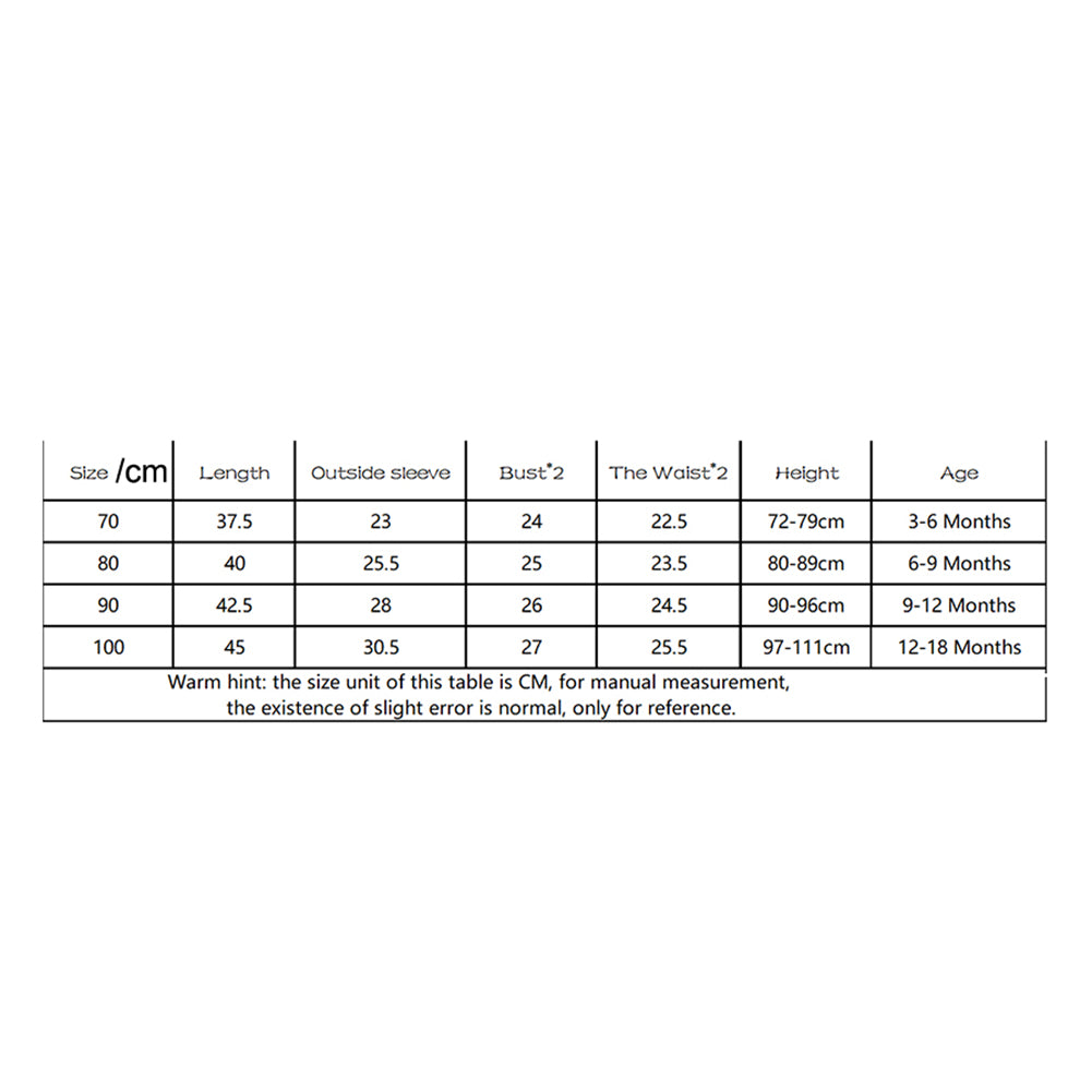[Our Size 70cm(3-6M)] Length: 37.5cm/14.76", 1/2 Bust: 24cm/9.45", 1/2 Waist: 22.5cm/8.86", Sleeve: 23.0cm/9.06", Suitable Height: 72cm - 79cm/28.34" - 31.10" (Approx.)