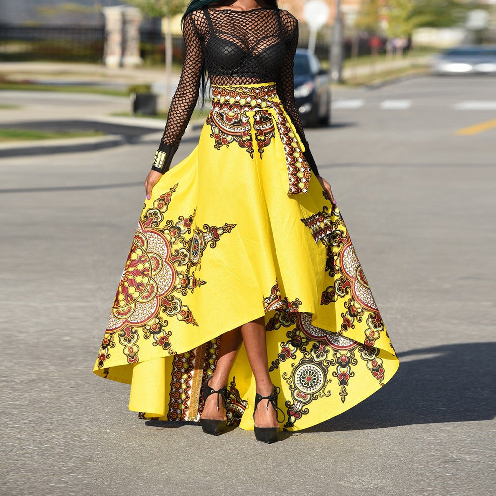 Ethnic Pattern Irregular Women Spring Summer Party Banquet Long Umbrella Skirt