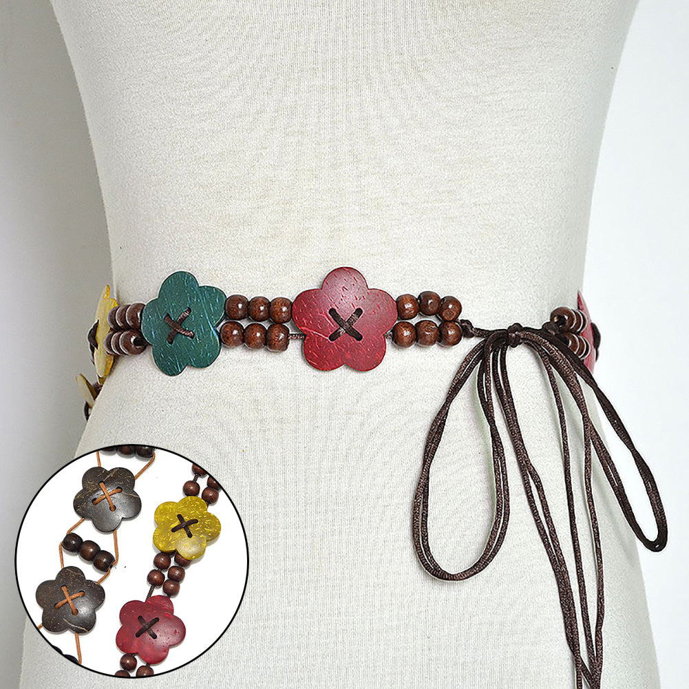 Ethnic Style Women Wood Beads Flower Wide Waist Belt Self-Tie Dress Waistband
