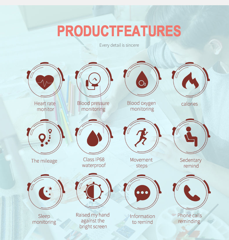 Other functions: Multiple sports modes;Call rejection;Alarm cloc,Do not disturb,Anti-lost,Remote camera,OTA upgrade