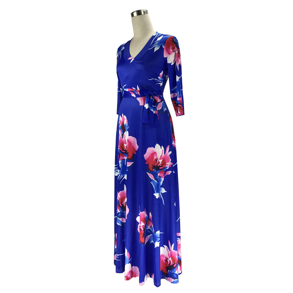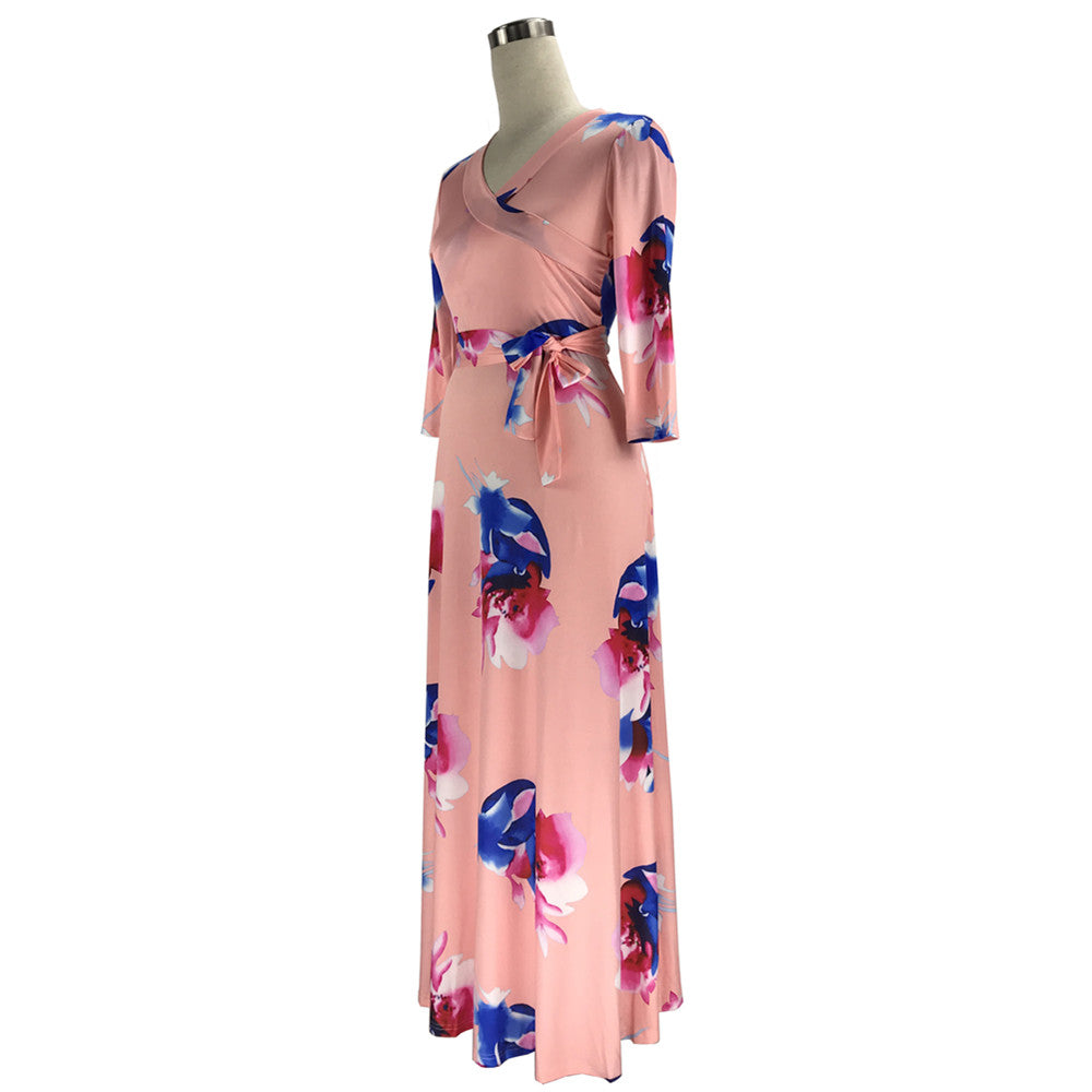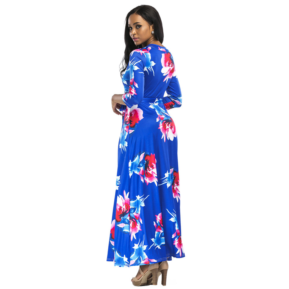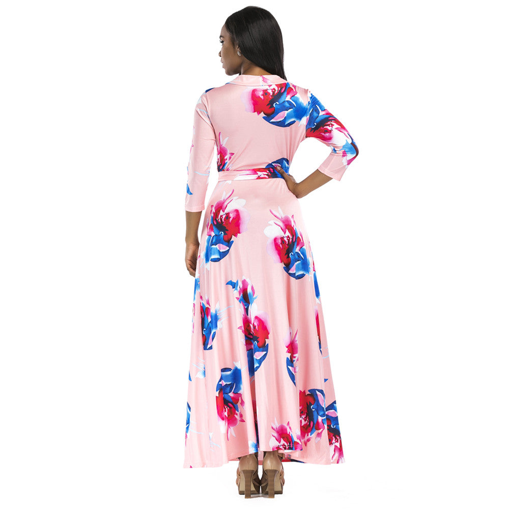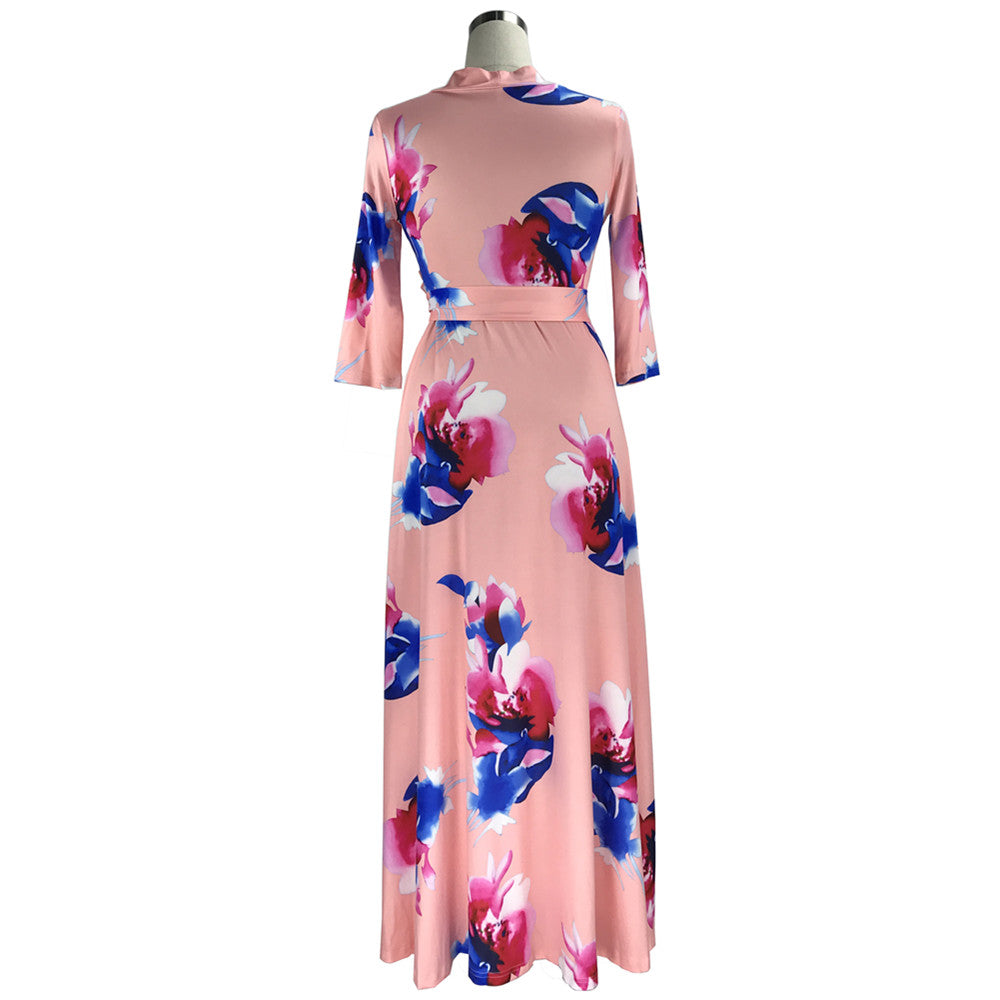Floral Print Elastic Long Maxi Dresses Women's Sexy Three-quarter Sleeve V-Neck Casual Dress With Bowknot Belt S-XL
