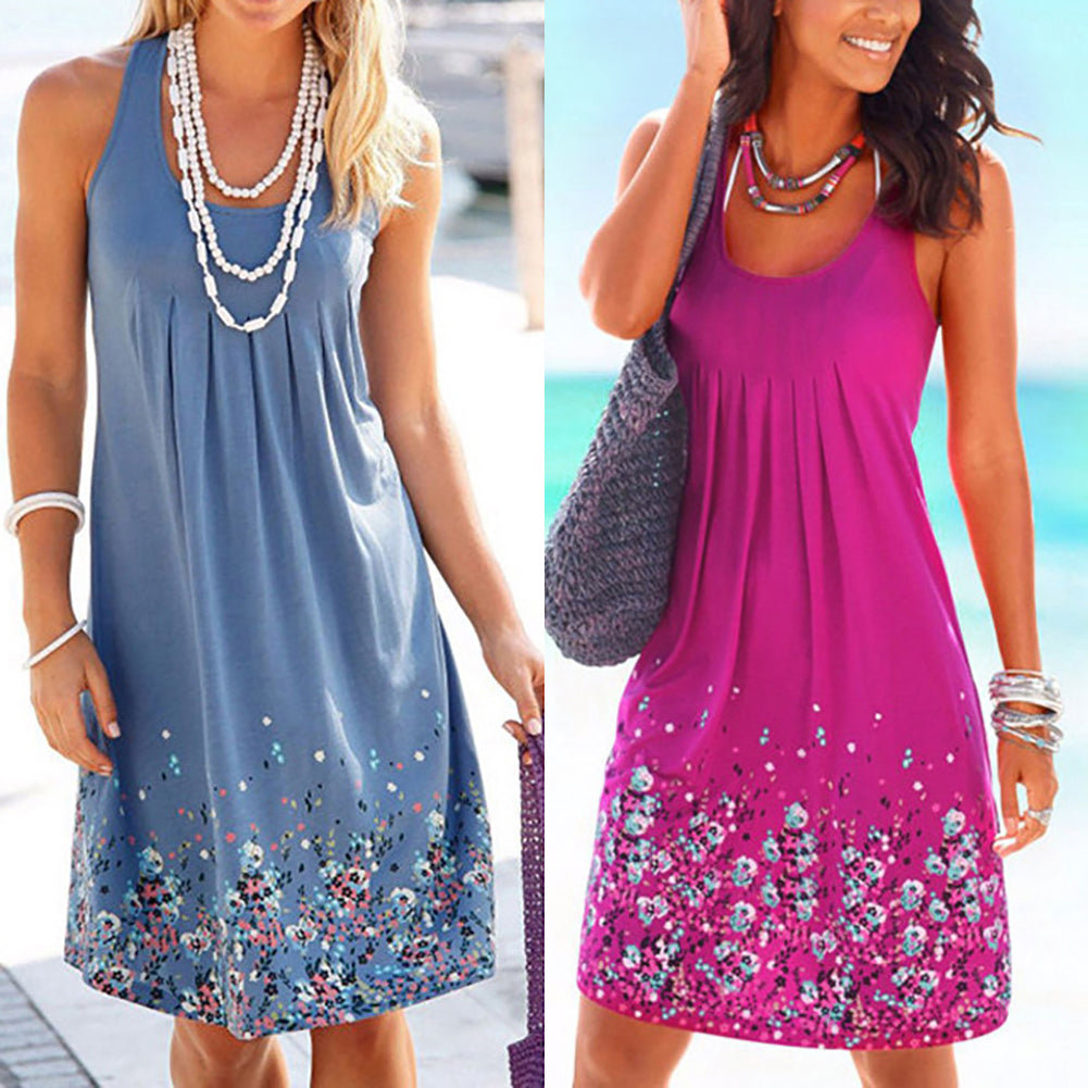Flower Print Sleeveless Women Loose Summer Beach Evening Party Boho Mini Dress