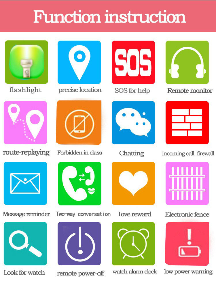 Function application: base station, GPS, LBS triple positioning, two-way call, remote monitoring, SOS a key help, security fence, voice intercom, footprint, sleep monitoring, light sense off, low battery alarm, remote shutdown, pedometer , Hand alarm, class Do not disturb, love reward, language micro chat, lighting, camera.