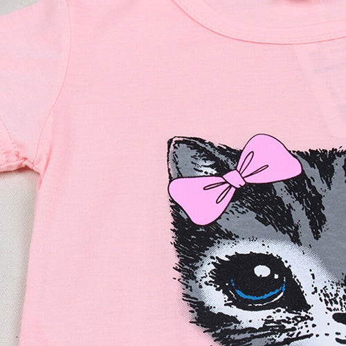 Kids Girls Fashion Summer Short Sleeve Cute Cat Bowknot Dress O-Neck Dress