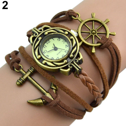 Lady Retro Rudder Anchor Charm Faux Leather Band Bracelet Quartz Wrist Watch