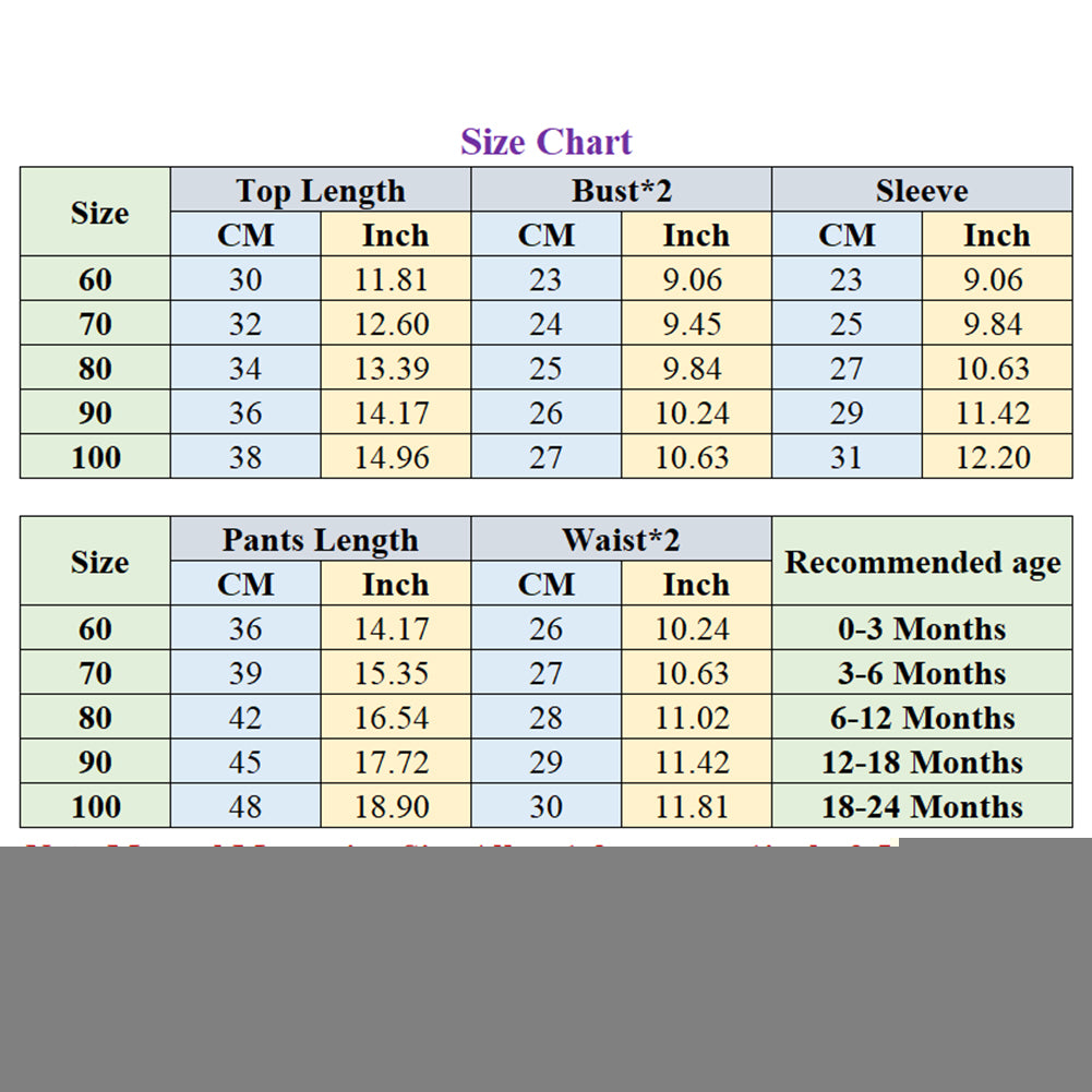 [Our Size 6-12 Months] Top Length: 34cm/13.39", Bust: 50cm/19.68", Sleeve: 27cm/10.63", Pants Length: 42cm/16.54" Waist: 56cm/22.04" (Approx.)
