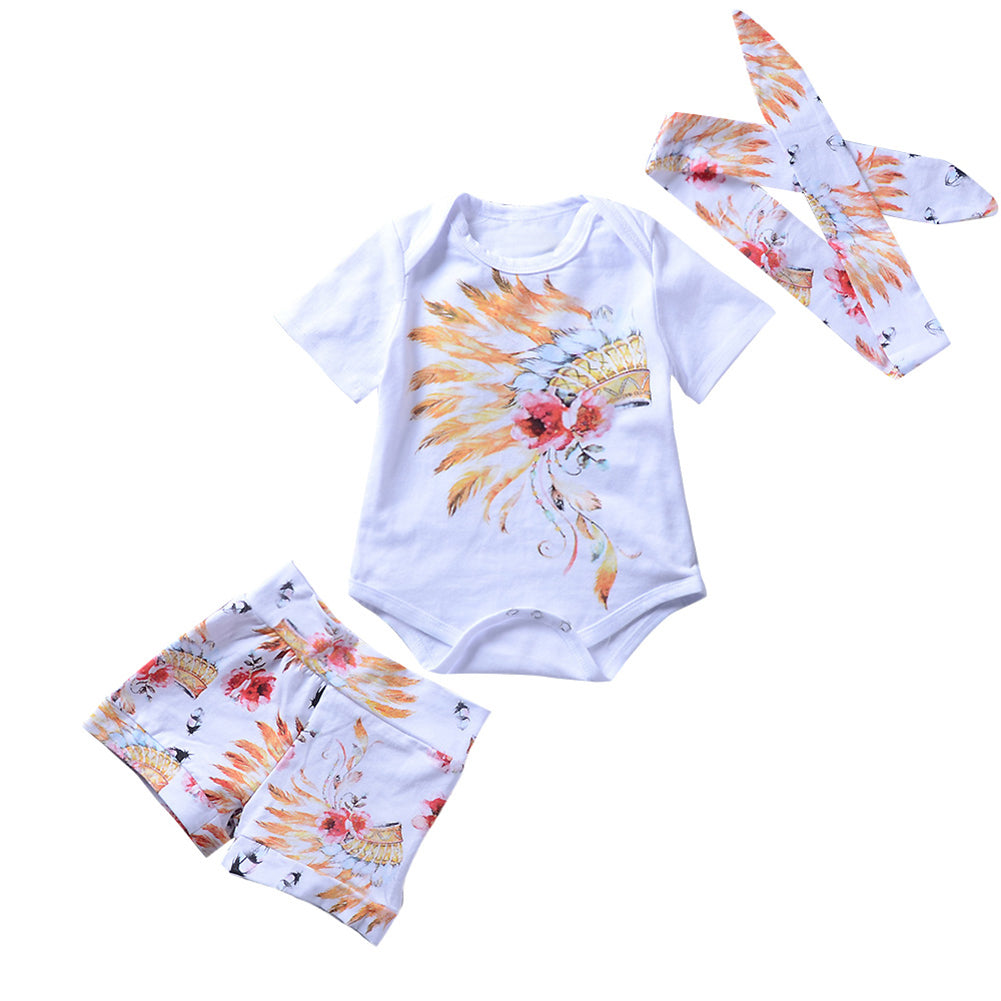 Indian flower pattern print short sleeve romper + short pants set.