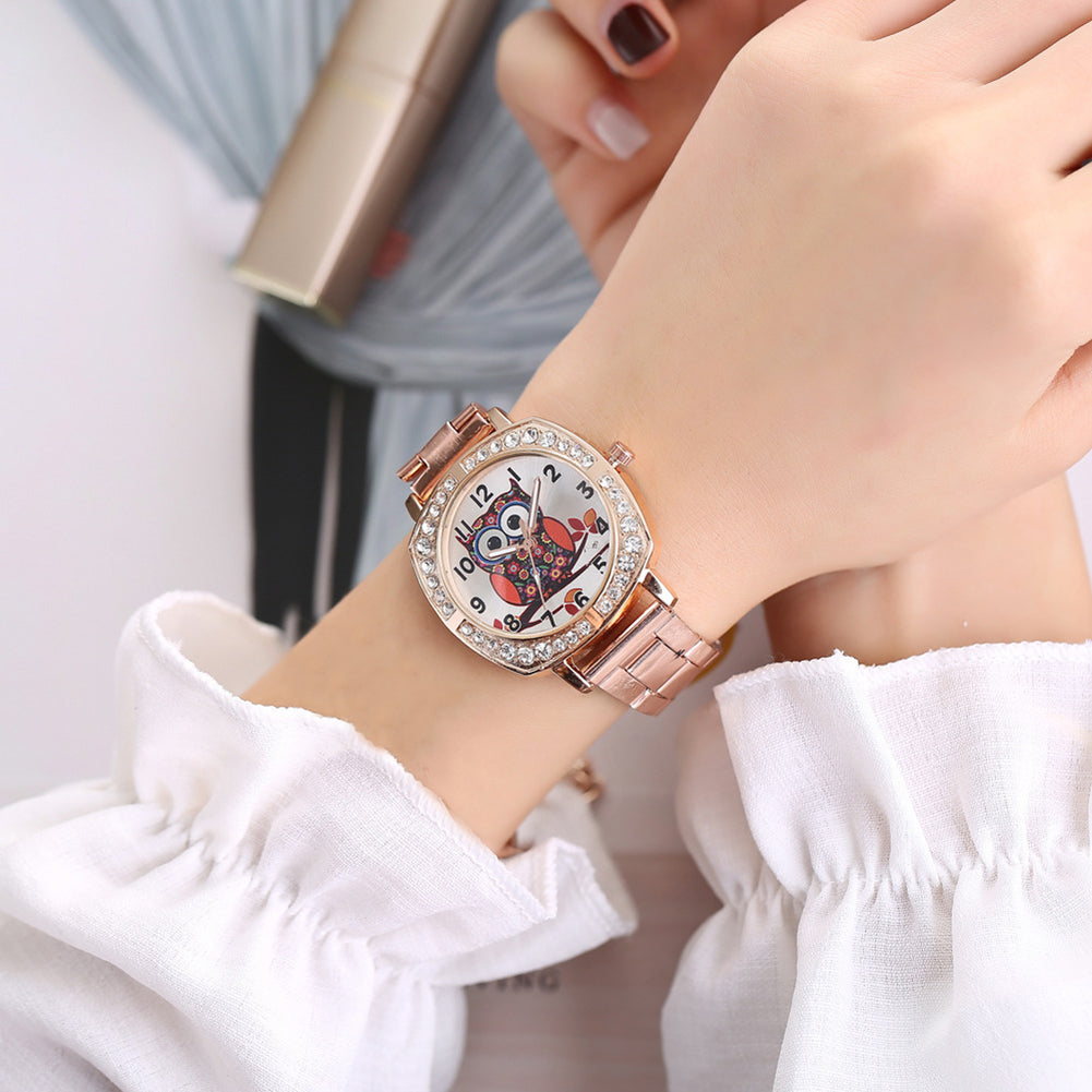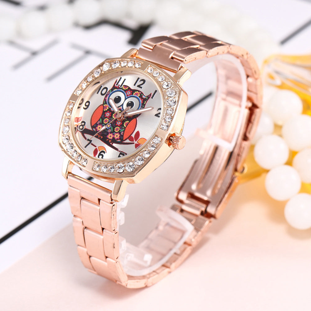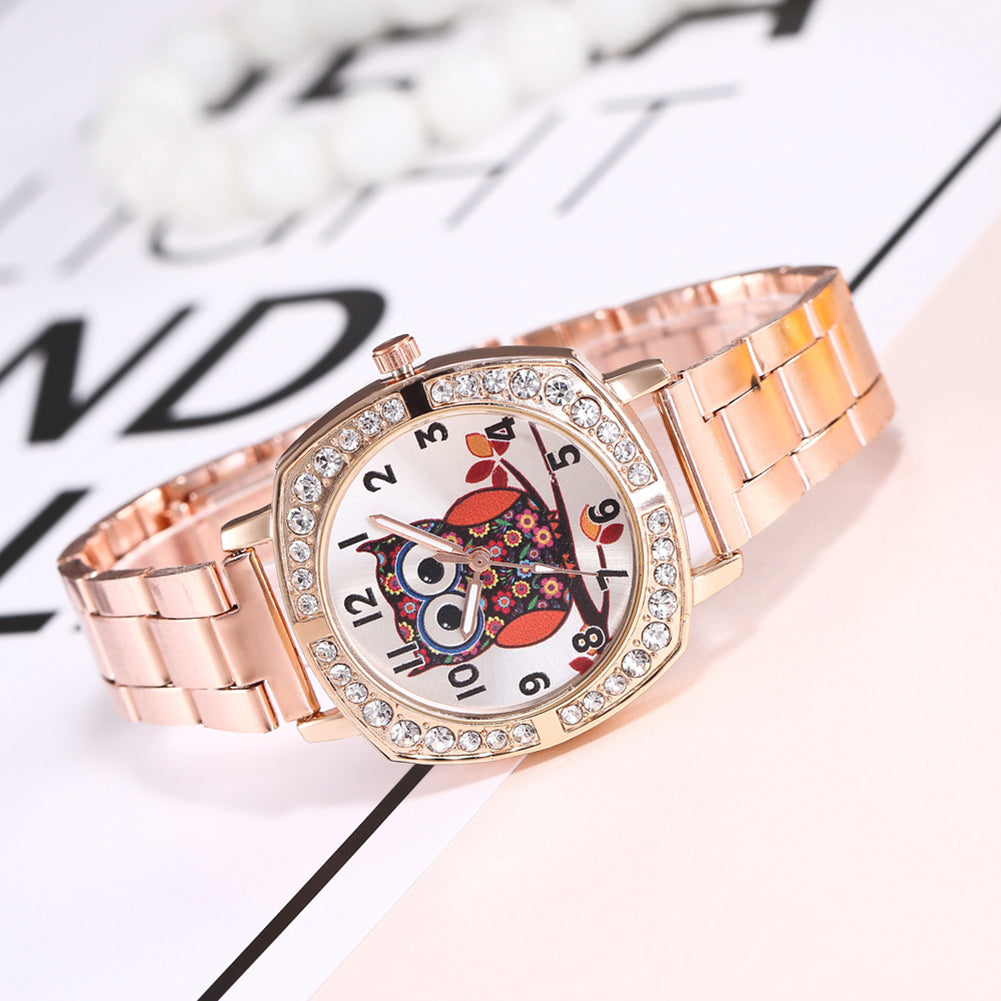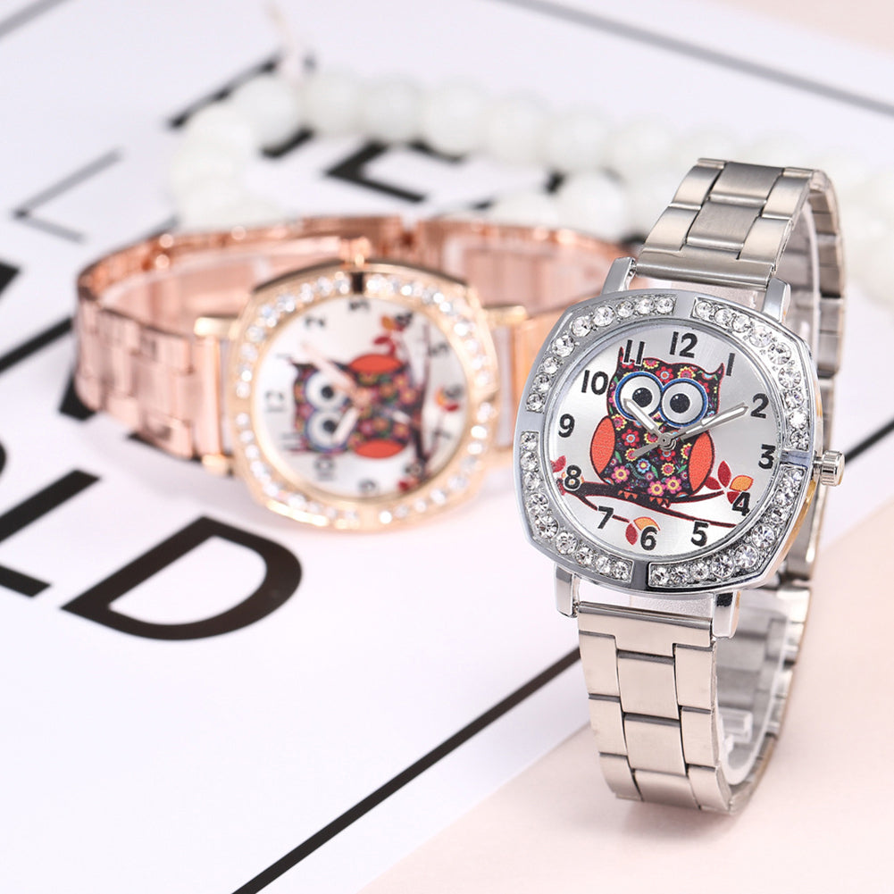 Owl Rhinestone Metal Band Square Case Women Quartz Wrist Watch Jewelry Gift