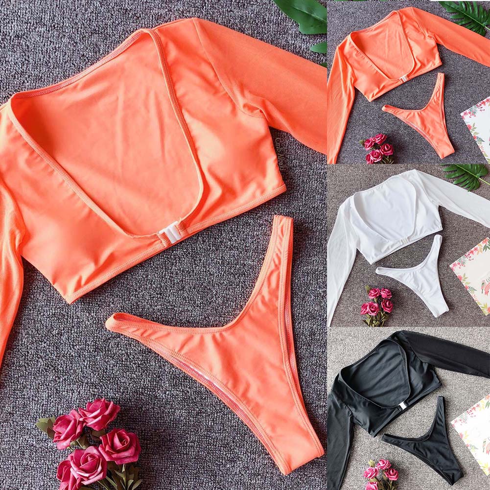Solid Color Buckled Long Sleeve Crop Top Briefs Lady Two-piece Swimsuit Swimwear