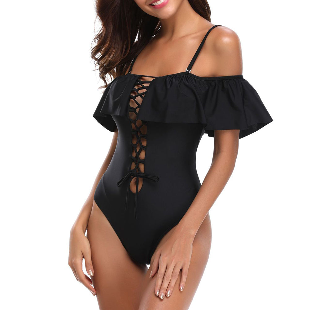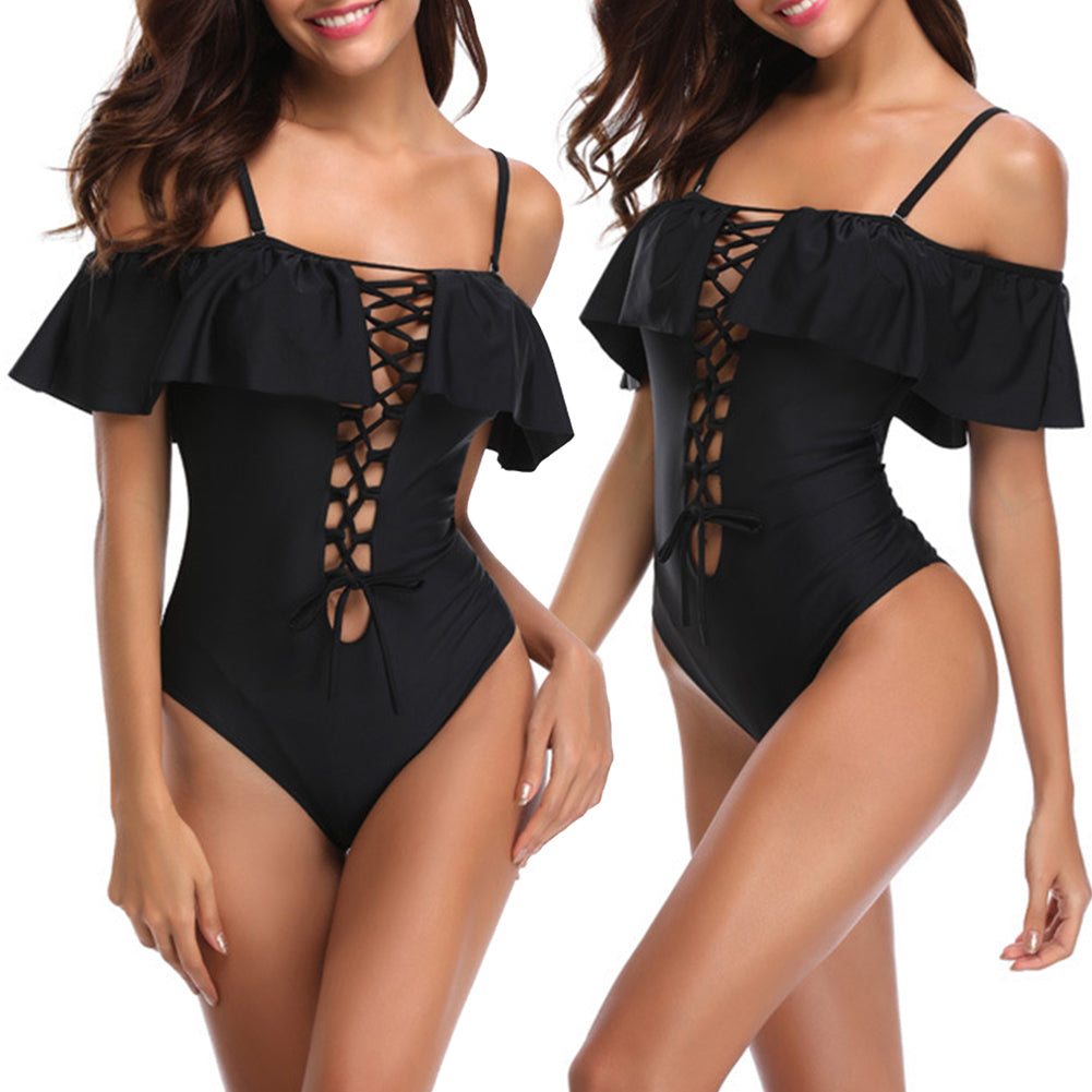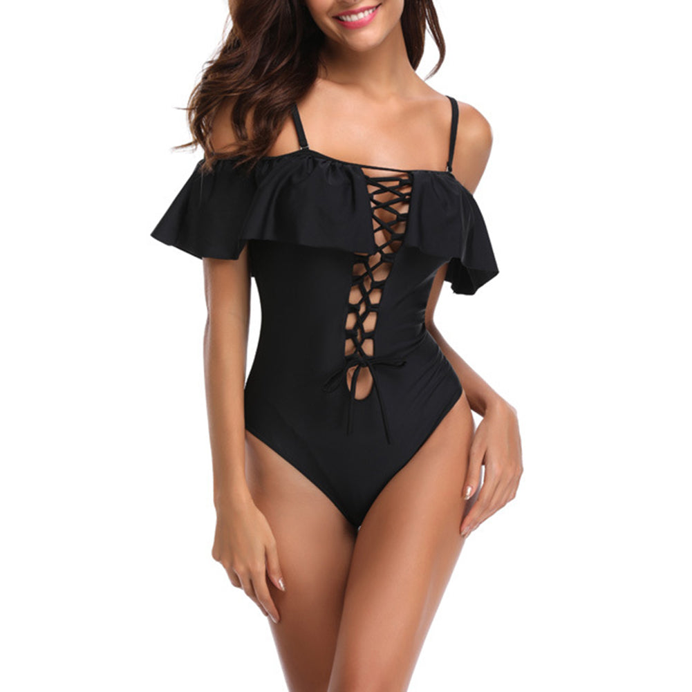 Women Off Shoulder Sexy Chest Tie Bandage Ruffled One Piece Swimwear Monokini