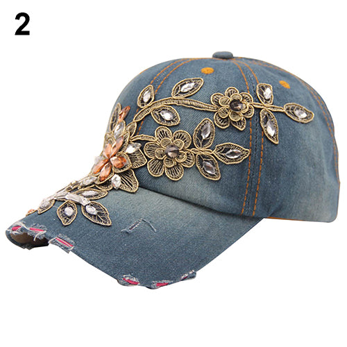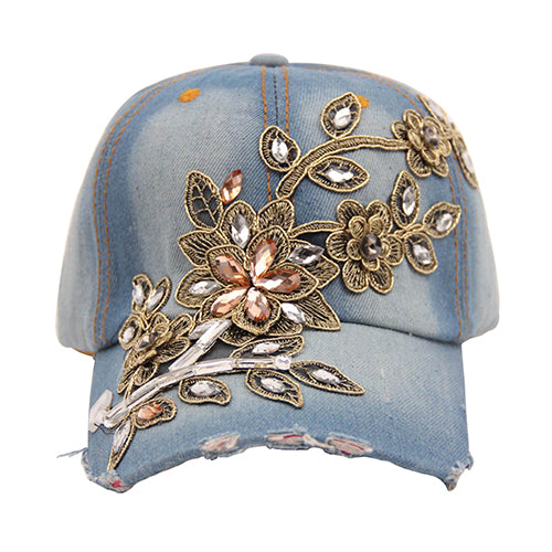 Features: Embossing Flower, Rhinestone Inlaid, Adjustable, Denim Baseball Cap