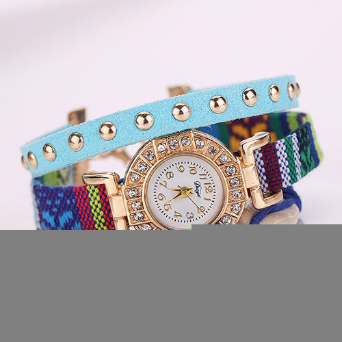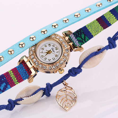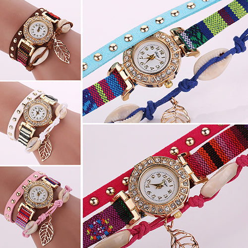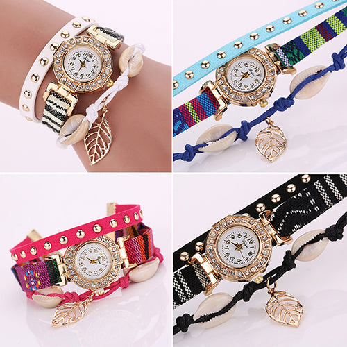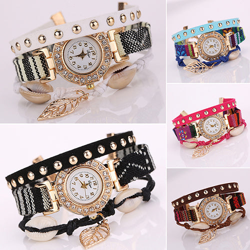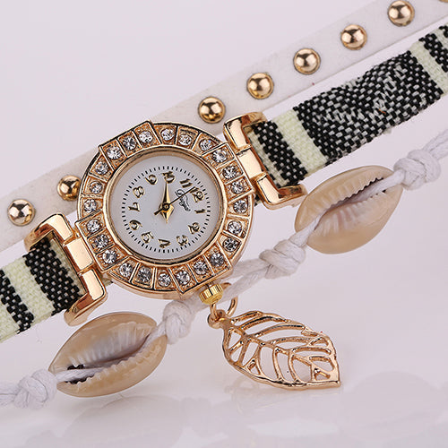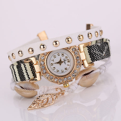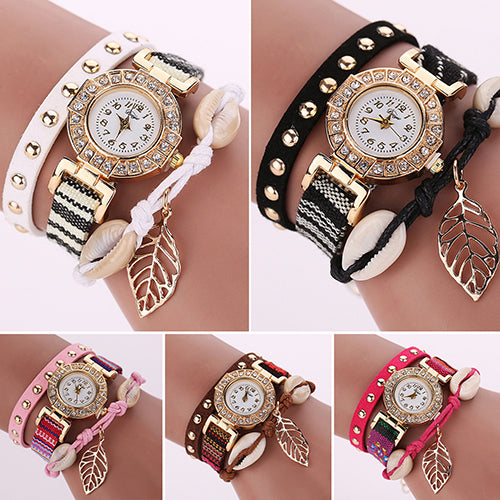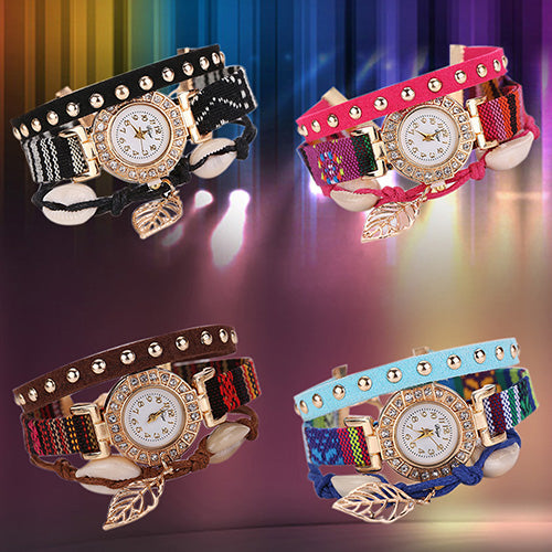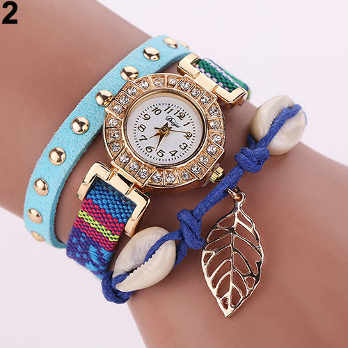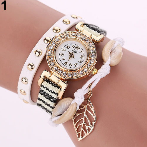 Women's Inlaid Rhinestone Leaf Shell Rivet Faux Leather Braided Band Wrist Watch
