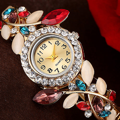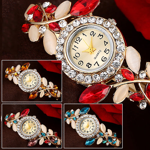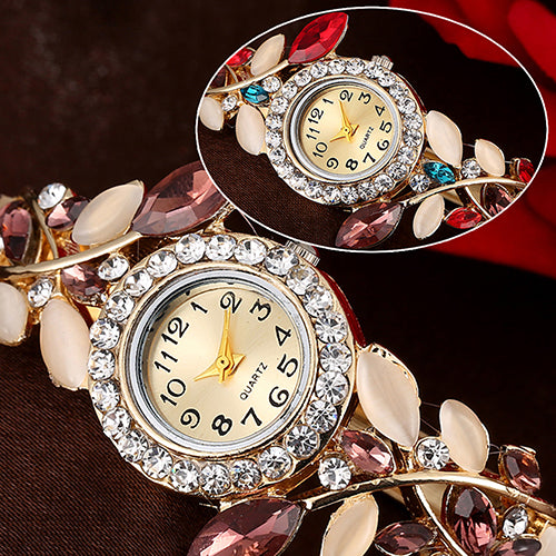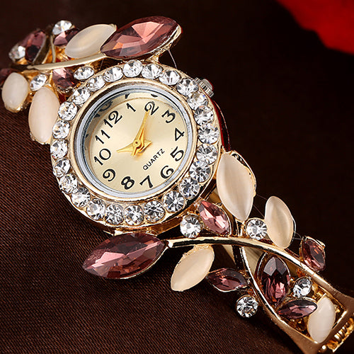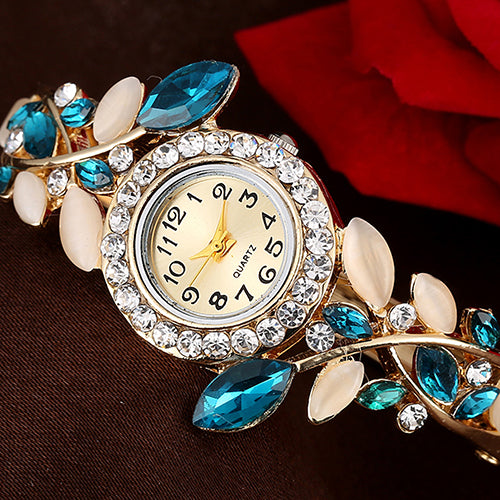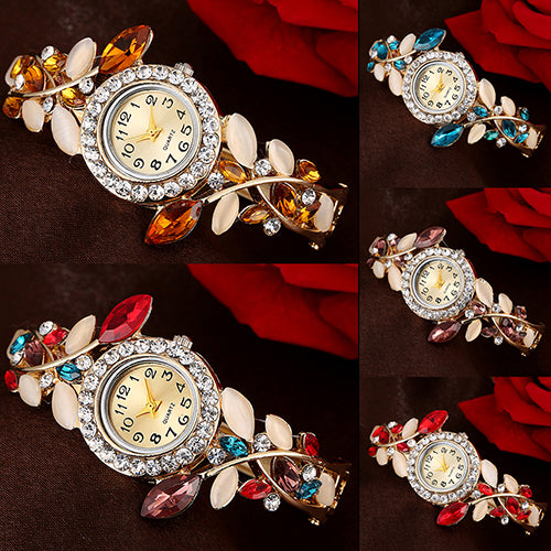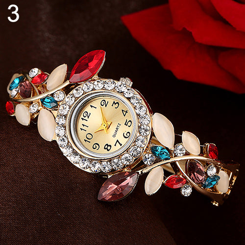 Women's Leaves Round Dial Rhinestone Inlaid Bracelet Quartz Dress Wrist Watch
