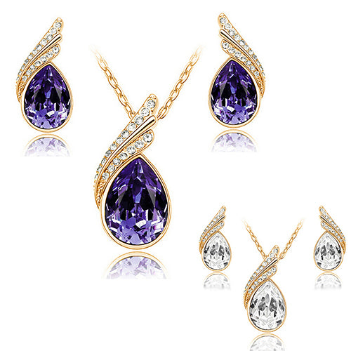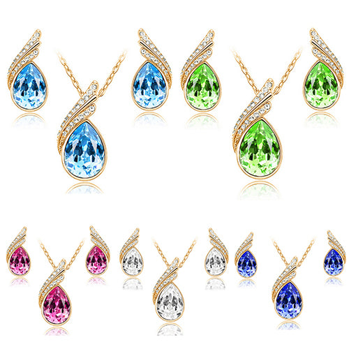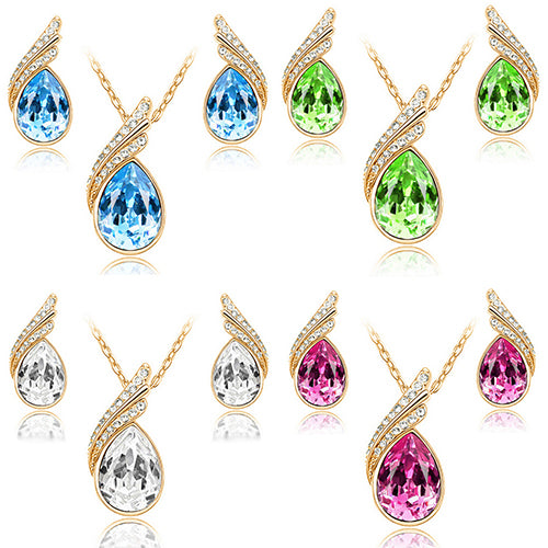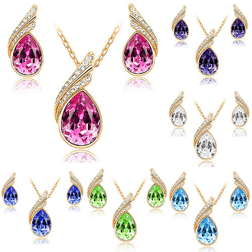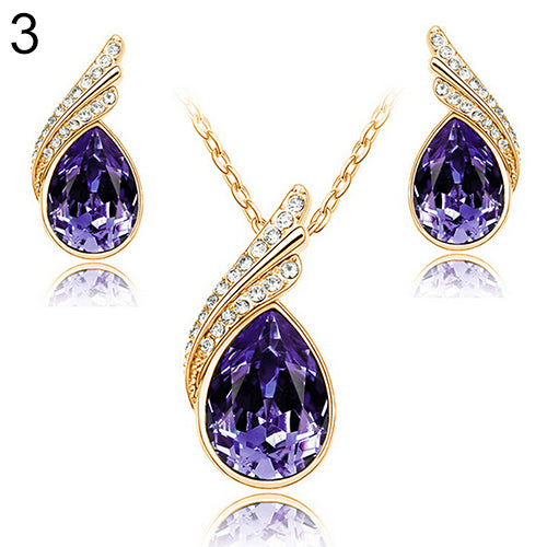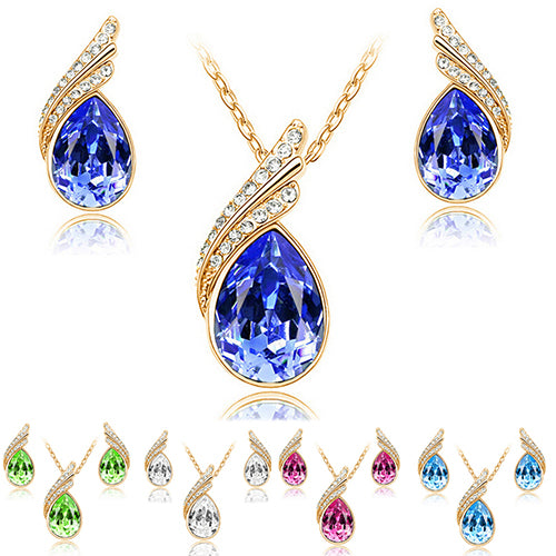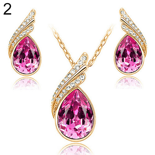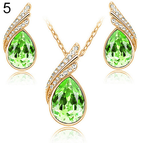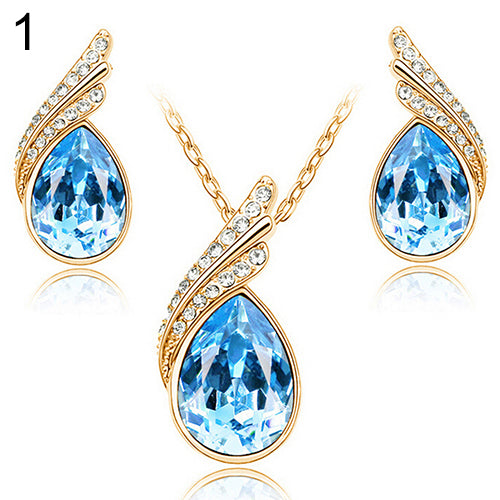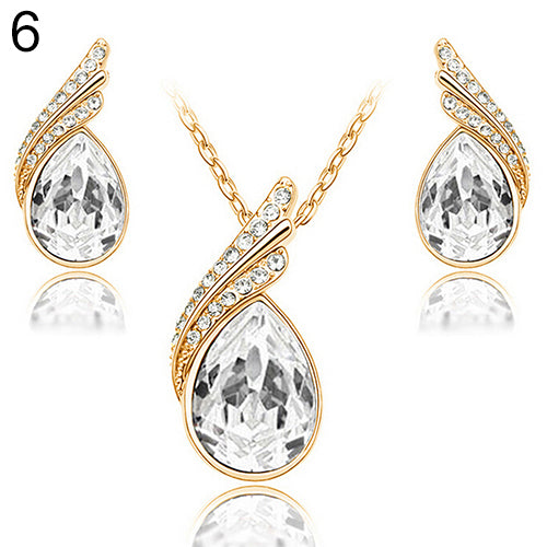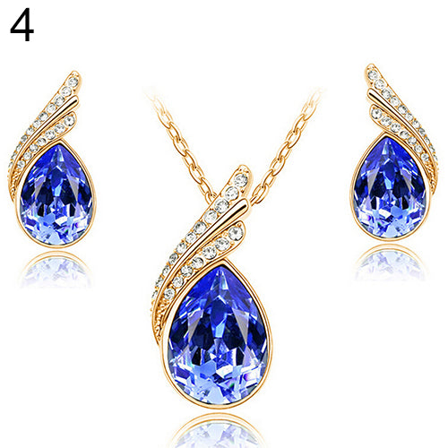 Women's Party Banquet Waterdrop Jewelry Set Crystal Pendant Necklace Earrings Golden Tone.