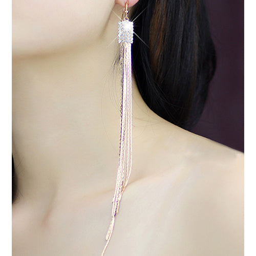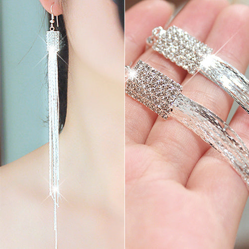 This pair of party hook dangle linear earrings are made by sparkling square rhinestone with long tassels style, which can match with suitable apparel for different occasion.