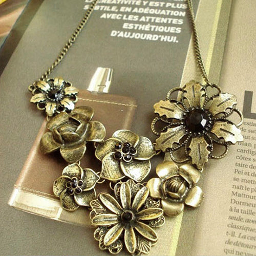 Women's Vintage Inlaid Black Rhinestone Bronze Flowers Pendant Necklace Choker