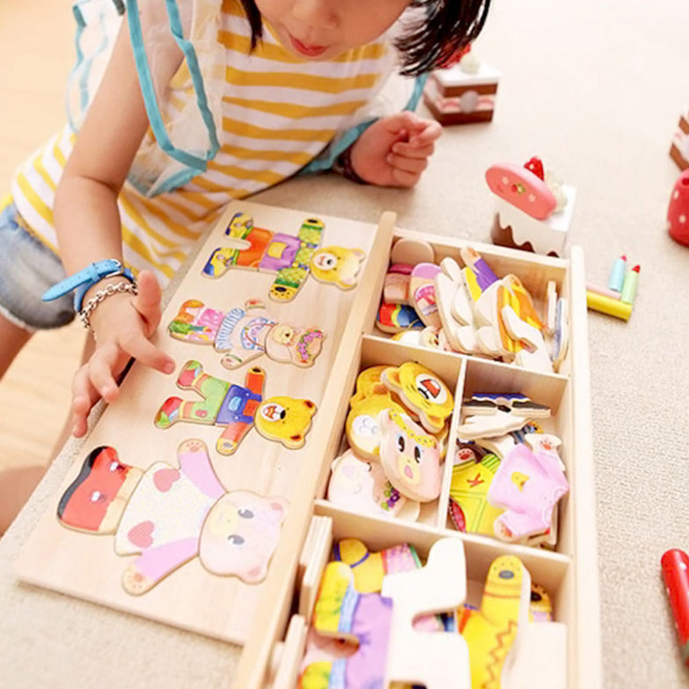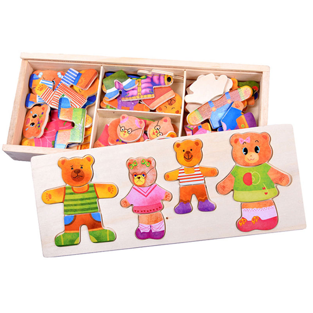 Wooden Baby Bear Changing Clothes Puzzle Set Children Kids Educational Toys Gift
