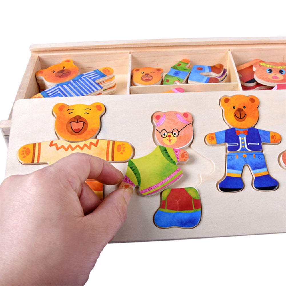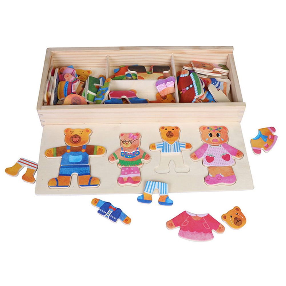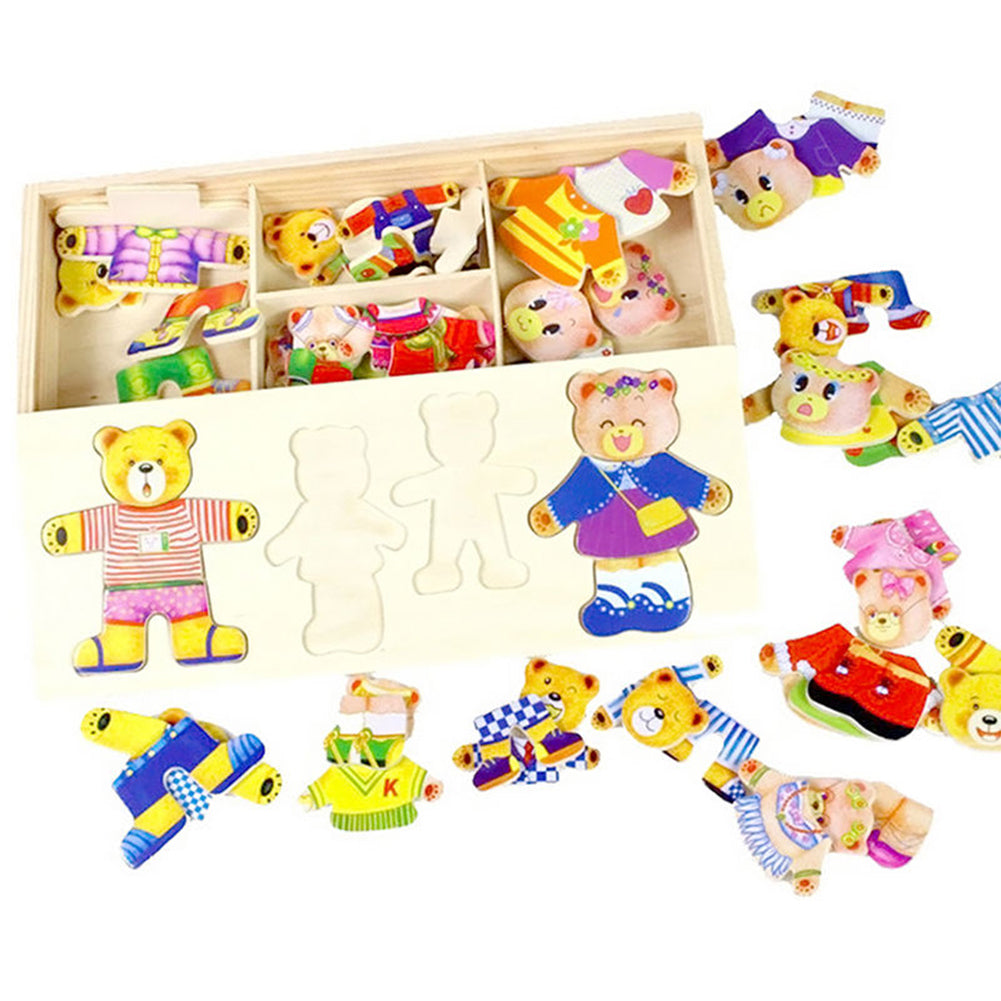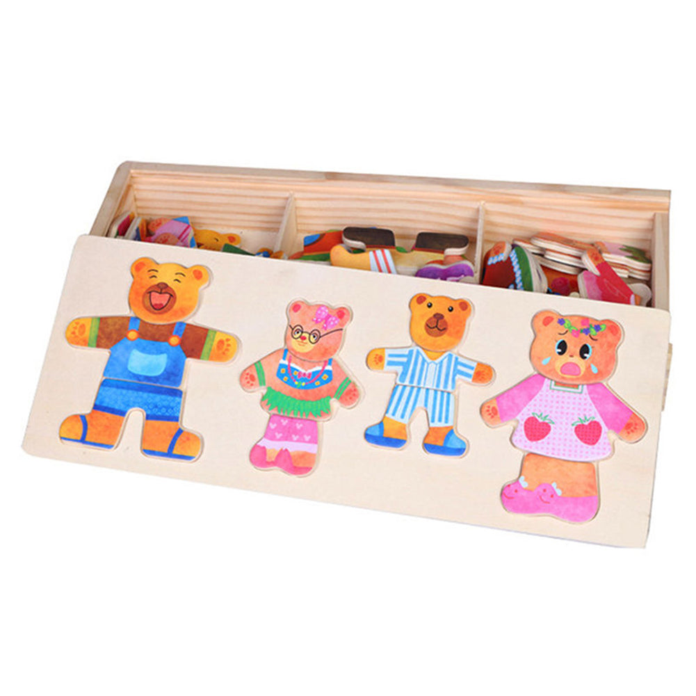 Wooden Baby Bear Changing Clothes Puzzle Set Children Kids Educational Toys Gift